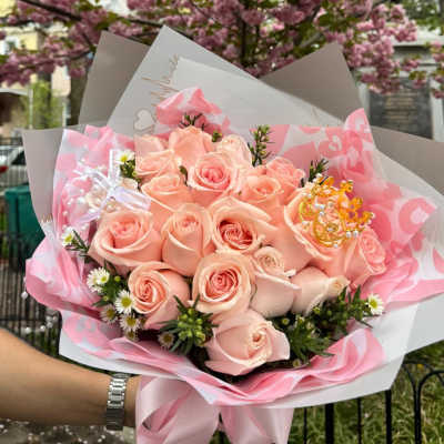 Price: $80.00 Sunset glow ( 12 light pink roses with mini roses, 3 sunflowers, and accompanied by greenery and eucalyptus. Product Tags: Same-day Delivery