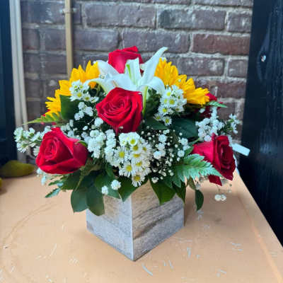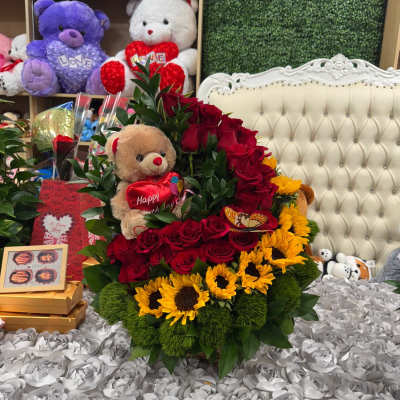 Price: $80.00 Sunset glow ( 12 light pink roses with mini roses, 3 sunflowers, and accompanied by greenery and eucalyptus. Product Tags: Next-day Delivery